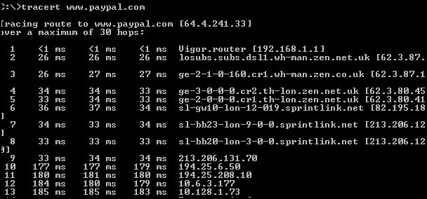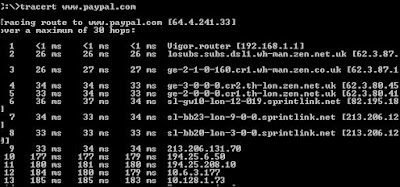 First of all I want to show you how many places have the possibility of intercepting your data when you login in to Paypal. It’s the very nature of the way the internet work that all your data flies across a huge array of shared hardware that makes up the infrastructure of the internet. If you want to see the route your request will travel to a particular website you can use the tracert command in Windows. Just select the command prompt and type the following