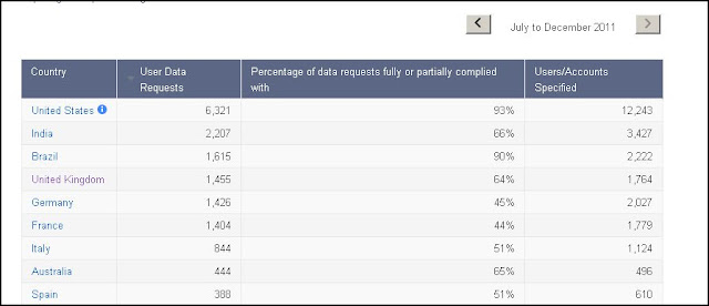 Well there’s again little way to tell, even using European data protection and privacy laws it would be difficult to find out. Google though does attempt some transparency by publishing the requests for accessing this data by Governments and Federal Organisations – here’s the top of the table for the last 6 months of 2011.